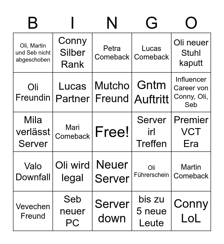 This bingo card has a free space and 24 words: Vevechen Freund, Oli wird legal, Mutcho Freund, bis zu 5 neue Leute, Oli neuer Stuhl kaputt, Oli, Martin und Seb nicht abgeschoben, Conny Silber Rank, Petra Comeback, Server irl Treffen, Premier VCT Era, Mila verlässt Server, Lucas Partner, Oli Führerschein, Martin Comeback, Oli Freundin, Seb neuer PC, Server down, Lucas Comeback, Influencer Career von Conny, Oli, Seb, Valo Downfall, Mari Comeback, Neuer Server, Gntm Auftritt and Conny LoL.