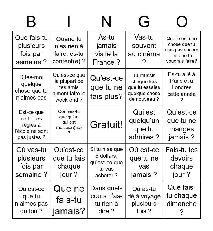 This bingo card has a free space and 24 words: Qu’est-ce que tu fais chaque jour ?, Que ne fais-tu jamais?, Qu’est-ce que tu ne fais plus?, Qu’est-ce que tu n’aimes pas du tout?, Quelle est une chose que tu n’as pas encore fait que tu voudrais faire?, Que fais-tu plusieurs fois par semaine ?, Dites-moi quelque chose que tu n’aimes pas, Quand tu n’as rien à faire, es-tu content(e) ?, Qui est quelqu’un que tu admires ?, Si tu n’as que 5 dollars, qu’est-ce que tu vas acheter ?, Tu réussis chaque fois que tu essaies quelque chose de nouveau ?, Est-ce que certaines règles à l’école ne sont pas justes ?, Où est-ce que tu ne vas jamais ?, Fais-tu tes devoirs chaque jour ?, Qu’est-ce que la plupart de tes amis aiment faire le week-end ?, Où as-tu déjà voyagé plusieurs fois ?, Qu’est-ce que tu ne manges jamais ?, As-tu jamais visité la France ?, Es-tu allé à Paris et à Londres cette année ?, Connais-tu quelqu’un qui est musicien(ne) ?, Que fais-tu chaque dimanche ?, Où vas-tu plusieurs fois par semaine ?, Vas-tu souvent au cinéma ? and Dans quels cours n’as-tu rien à dire ?.