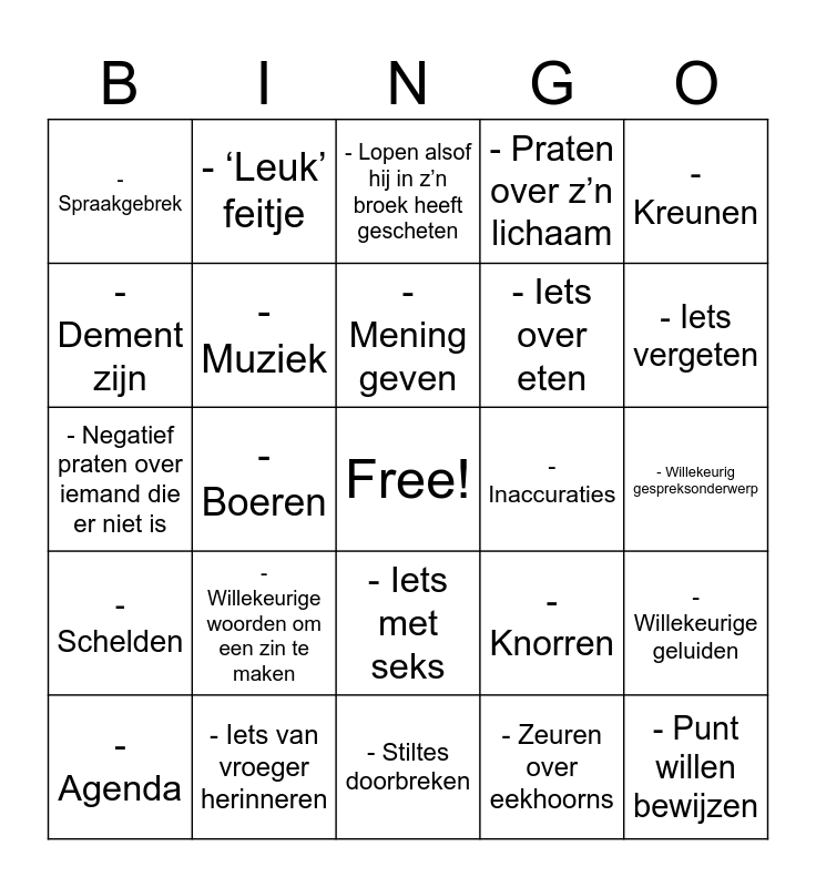 This bingo card has a free space and 33 words: Max bingo, - Schijten, - Boeren, - Iets over z’n ballen, - Schelden, - Muziek, - Kreunen, - Agenda, - ‘Leuk’ feitje, - Observaties, - Mening geven, - Lopen alsof hij in z’n broek heeft gescheten, - Homofobie, - Rasisme, - Inaccuraties, - Iets vergeten, - Iets van vroeger herinneren, - Negatief praten over iemand die er niet is, - Willekeurige woorden om een zin te maken, - Knorren, - Iets met seks, - Zingen, - Spraakgebrek, - Willekeurig gespreksonderwerp, - Stiltes doorbreken, - Punt willen bewijzen, - Praten over z’n lichaam, - Iets over eten, - Dement zijn, - Willekeurige geluiden, - Excuusjes, - Zeuren over eekhoorns and - Willekeurige foto.