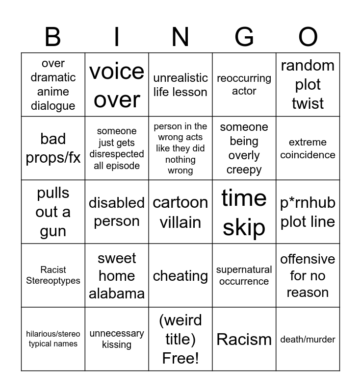 This bingo card has 25 words: Racist Stereoptypes, unnecessary kissing, cartoon villain, Racism, random plot twist, over dramatic anime dialogue, voice over, unrealistic life lesson, time skip, offensive for no reason, bad props/fx, someone just gets disrespected all episode, (weird title) Free!, supernatural occurrence, extreme coincidence, hilarious/stereo typical names, disabled person, person in the wrong acts like they did nothing wrong, someone being overly creepy, p*rnhub plot line, pulls out a gun, sweet home alabama, cheating, reoccurring actor and death/murder.