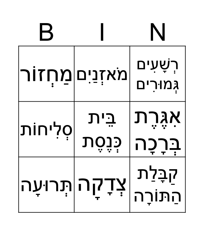 This bingo card has a free space and 8 words: אִגֶּרֶת בְּרָכָה, רְשָׁעִים גְּמוּרִים, מֹאזְנַיִם, תְּרוּעָה, מַחְזוֹר, קַבָּלַת הַתּוֹרָה, סְלִיחוֹת and צְדָקָה.
