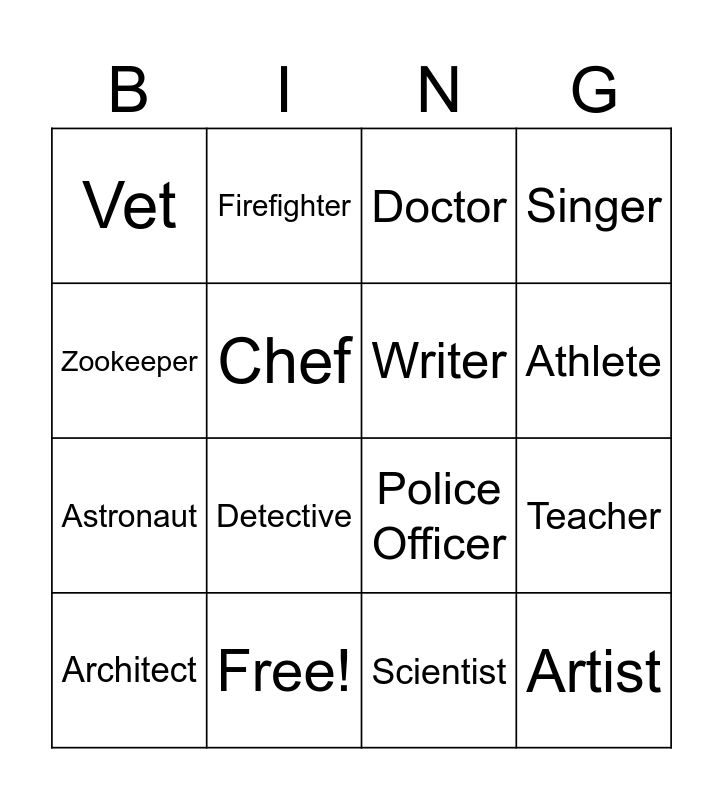 This bingo card has 16 words: Free!, Teacher, Doctor, Vet, Astronaut, Firefighter, Police Officer, Scientist, Zookeeper, Chef, Architect, Singer, Detective, Athlete, Writer and Artist.