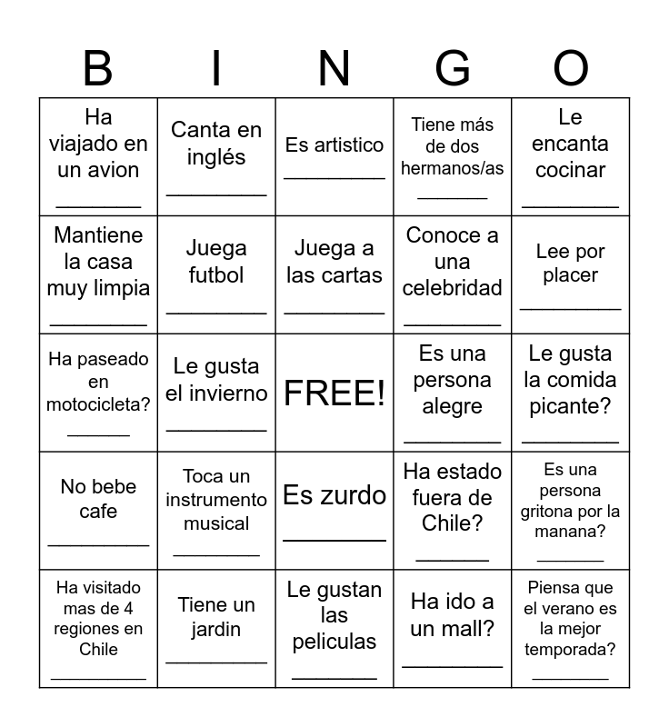 This bingo card has a free space and 24 words: Toca un instrumento musical ________, Tiene un jardin _________, Juega a las cartas ________, Ha visitado mas de 4 regiones en Chile __________, Le encanta cocinar ________, Ha viajado en un avion _______, Mantiene la casa muy limpia ________, Canta en inglés ________, Es una persona alegre ________, Es zurdo _______, Conoce a una celebridad ________, Ha paseado en motocicleta? ______, Ha estado fuera de Chile? ______, Es una persona gritona por la manana? _______, Juega futbol ________, Ha ido a un mall? ________, Le gusta la comida picante? ________, Es artistico _________, Lee por placer _________, Le gusta el invierno ________, Piensa que el verano es la mejor temporada? ________, No bebe cafe _________, Tiene más de dos hermanos/as _______ and Le gustan las peliculas _______.
