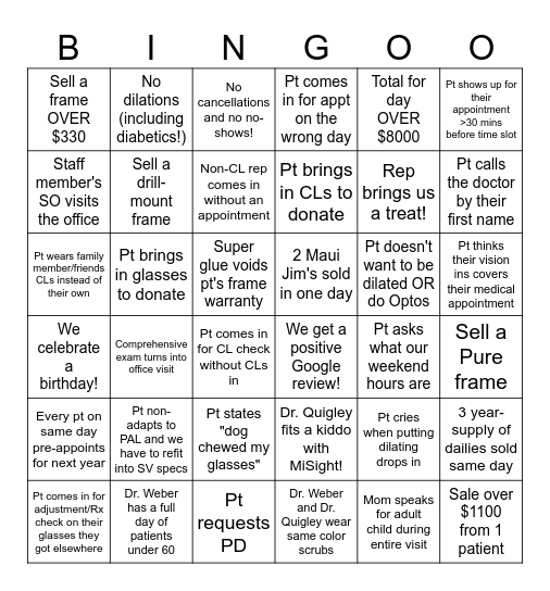 This bingo card has 36 words: Dr. Quigley fits a kiddo with MiSight!, Pt states "dog chewed my glasses", Dr. Weber and Dr. Quigley wear same color scrubs, Staff member's SO visits the office, We celebrate a birthday!, 2 Maui Jim's sold in one day, Sell a drill-mount frame, Pt requests PD, Total for day OVER $8000, Pt cries when putting dilating drops in, Pt calls the doctor by their first name, Pt comes in for appt on the wrong day, 3 year-supply of dailies sold same day, Pt brings in glasses to donate, Pt brings in CLs to donate, Sell a frame OVER $330, Every pt on same day pre-appoints for next year, Pt doesn't want to be dilated OR do Optos, Pt wears family member/friends CLs instead of their own, No cancellations and no no-shows!, Super glue voids pt's frame warranty, Comprehensive exam turns into office visit, We get a positive Google review!, Pt comes in for CL check without CLs in, Pt asks what our weekend hours are, No dilations (including diabetics!), Rep brings us a treat!, Dr. Weber has a full day of patients under 60, Non-CL rep comes in without an appointment, Pt shows up for their appointment >30 mins before time slot, Sale over $1100 from 1 patient, Pt comes in for adjustment/Rx check on their glasses they got elsewhere, Sell a Pure frame, Pt thinks their vision ins covers their medical appointment, Pt non-adapts to PAL and we have to refit into SV specs and Mom speaks for adult child during entire visit.