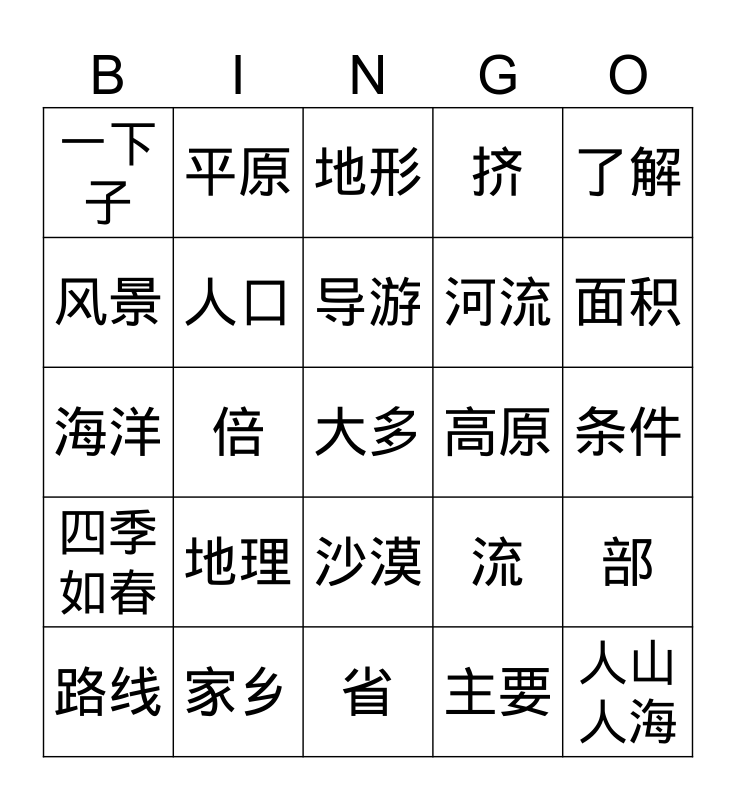 This bingo card has a free space and 24 words: 地理, 家乡, 导游, 路线, 了解, 一下子, 风景, 平原, 高原, 沙漠, 河流, 海洋, 流, 部, 人口, 主要, 条件, 地形, 面积, 倍, 人山人海, 四季如春, 挤 and 省.