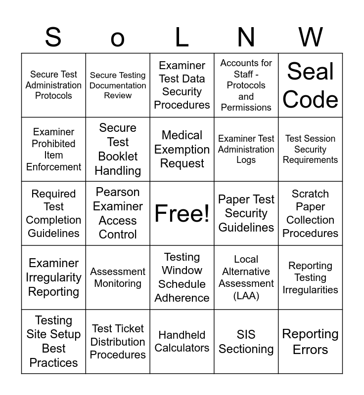 This bingo card has a free space and 250 words: Standards of Learning (SOL), TestNav, Accommodations, PearsonAccess next, School Test Coordinator (STC), Expedited Retake, Irregularity, Paper Test, Parent Notification, Scratch Paper, Online Testing, Proctor, Adjustments, Testing Window, Training, Assessment Plan, Coding, Reporting Errors, Test Memo, Seal Code, Multilingual Learners (MLs), Virginia Alternate Assessment Program (VAAP), End-of-Course (EOC), CAPS (Centralized Assessment Processing System), Local Alternative Assessment (LAA), Pearson Training Tests, WIDA Testing, CogAT Testing, Mathematics SOL, Reading SOL, Science SOL, Social Studies SOL, Test Security Agreement, SIS Sectioning, PNP (Personal Needs Profile), Special Request Expedited Retakes, Test Implementation Manual (TIM), School Data Tools, Accommodation #1 (Multiple Test Sessions), Accommodation #26 (Calculator), Accommodation #32 (Fidgets), PNP Calculator, Desmos Virginia Calculator, Audio Test Accommodation, Read Aloud Accommodation, Handheld Calculators, Periodic Table Accommodation, Bilingual Dictionary, English Dictionary, Rule of Two, Student Registration Import (SRI), Testing Status 9 (Previously Passed), Test Status (ES & MS), Medical Exemption Request, FCPS Administration Affidavit, FCPS Transcription Affidavit, Secure Testing Materials, Non-Secure Testing Materials, Test Session Naming Convention, Examiner’s Manual, Test Planning, Proctoring Guidelines, Break Procedures, Struggling EL Students, Test Blueprints, Math Question Sets, Pencil Overlay Tool, Guided Practice Suggestions, Test Item Stimulus, Post-Equating, Formula Sheets, Testing Irregularity Session, Accounts for Staff - Protocols and Permissions, Naming Test Sessions in PearsonAccess next, Expedited Retake Coding, Electronic Device Policy, Homebound Testing, Examiner's Test Booklets, Braille and Large Print Tests, Answer Documents, Paper Testing Eligibility, Temporary Accommodation Request, School Report Viewer, School Project Manager, Online Test Monitor, Test Tickets, Transmittal Forms, Student STI Number, Scratch Paper Guidelines, Non-FCPS Student Transfer Procedures, Test Session Locking Procedures, Active Testing Procedures, Test Alerts Resolution, Pearson Access Permissions, OAR Pearson Step-by-Step Guide, Out-of-School Support Document, SOL Practice Items, Alternative Learning Centers (ALCs), Secure Materials Return Process, SOL Training Verification, School Test Ticket Procedures, Assessment Monitoring, Pearson System Troubleshooting, Testing Accommodations Documentation, Paper Test Ordering Process, Test Session Security Requirements, Student Participation Logs, Secure Test Booklet Handling, Examiner Responsibilities, Test Session Setup Guidelines, Break Time Management, Testing Room Requirements, Active Testing: Troubleshooting Procedures, Expedited Retake Process, Parent Permission for Retakes, Test Readiness Checklist, Examiner Certification Requirements, Student Transfer Testing Process, Classroom Test Environment Guidelines, Test Session Management in Pearson, Reporting Testing Irregularities, Proctor Training Guidelines, Examiner Training Requirements, Test Status Updates, Accommodations Pre-Coding, Testing Data Review Procedures, Secure Testing Area Setup, Online Testing Health Check, Pearson System Alerts, Homebound Testing Security Measures, Prohibited Testing Materials, Secure Answer Sheet Handling, OAR Testing Support Contact, Scratch Paper Collection Procedures, Paper Test Submission Deadlines, Examiner Script Usage, Test Booklet Transmittal Process, Secure Material Return Checklist, Examiner Affidavit Completion, School-Level Testing Policies, Special Education Testing Guidelines, Assessment Accommodation Reviews, Local Testing Adjustments, Testing Material Audit Procedures, Examiner Log Sheets, OAR Examiner Communications, Student Testing Status Verification, Break Time Policy for Students, Examiner Test Monitoring Checklist, Online Test Interruption Handling, Student Test Exit Procedures, Secure Testing Storage Guidelines, Early Warning System (EWS), PearsonAccess next Role Assignments, School-Based Testing Irregularities, Irregularity Documentation Process, Testing Status Review in Pearson, Examiner Training Session Logs, Required Test Completion Guidelines, Testing Window Schedule Adherence, Examiner Secure Test Handling, Test Ticket Distribution Procedures, Examiner Handbook Guidelines, Secure Material Disposal Procedures, Pearson Examiner Access Control, Online Test Monitoring System, Testing Site Setup Best Practices, Examiner Role Responsibilities, School Test Administration Checklist, Exam Integrity Verification, Examiner Session Tracking, Secure Testing Computer Access, Emergency Testing Procedures, Student Test Attempt Monitoring, Testing Policy Adherence Checklist, Examiner Training Completion Records, Examiner Test Administration Logs, Secure Test Return Confirmation, Testing Environment Compliance, Testing Device Configuration Guidelines, Examiner Access Logs, Secure Test Distribution Tracking, Paper Test Security Guidelines, Examiner Online Testing Setup, Examiner Testing Supervision Procedures, Secure Testing Room Guidelines, Examiner Irregularity Reporting, Examiner Testing Documentation Review, Test Completion Verification Procedures, Examiner Secure Test Processing, Examiner Test Session Logging, Testing Compliance Checklist, Examiner Pre-Test Readiness, Online Test Room Supervision, Secure Testing Laptop Setup, Examiner Testing Policy Review, Student Testing Supervision Guidelines, Testing Security Procedures Review, Examiner Training Schedule Compliance, Testing Data Accuracy Review, Examiner Secure Storage Checklist, Secure Testing Room Setup Checklist, Examiner Secure Testing Equipment Guidelines, Secure Test Session Monitoring Procedures, Examiner Testing Time Tracking, Secure Answer Document Handling Procedures, Secure Testing Site Management Guidelines, Examiner Prohibited Items Policy, Secure Testing 