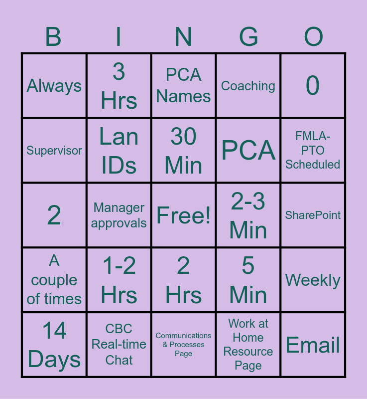 This bingo card has a free space and 29 words: 14 Days, Attendance, Manager approvals, 7 days, Always, PCA Names, Lan IDs, 1-2 Hrs, 2-3 Min, CBC Real-time Chat, SharePoint, Email, Communications & Processes Page, Work at Home Resource Page, FMLA-PTO Scheduled, FMLA-PTO Unscheduled, 2 Hrs, A couple of times, 0, 2, 5 Min, 15 Min, PCA, Supervisor, Coaching, 3 Hrs, Weekly, 30 Min and CBC Hub.