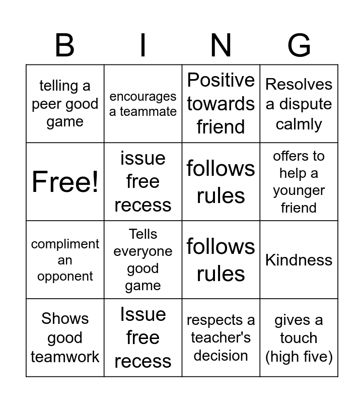 This bingo card has 16 words: Issue free recess, Kindness, Positive towards friend, telling a peer good game, compliment an opponent, encourages a teammate, follows rules, respects a teacher's decision, Free!, issue free recess, Shows good teamwork, Resolves a dispute calmly, Tells everyone good game, offers to help a younger friend, follows rules and gives a touch (high five).