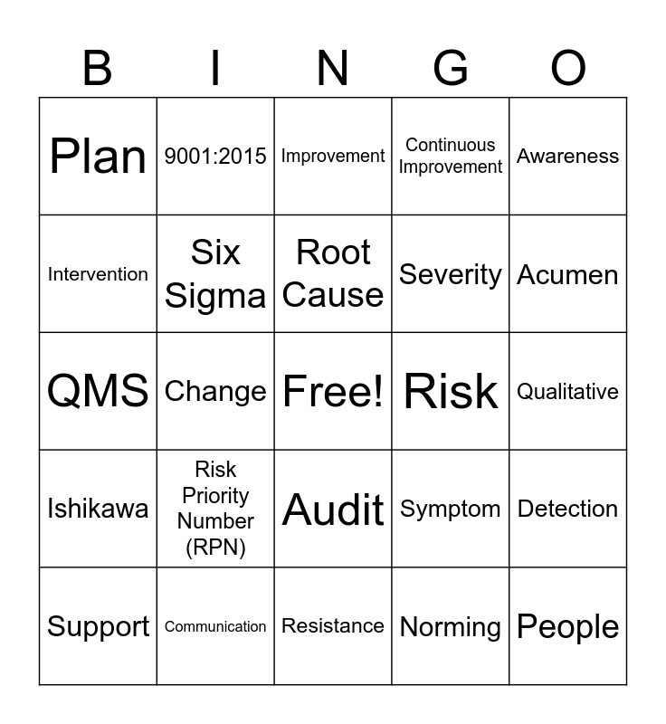 This bingo card has a free space and 24 words: Risk Priority Number (RPN), Communication, Root Cause, Support, Awareness, Plan, Intervention, 9001:2015, Risk, Audit, Severity, QMS, Symptom, Detection, Six Sigma, Norming, Qualitative, Improvement, Acumen, Change, People, Ishikawa, Continuous Improvement and Resistance.