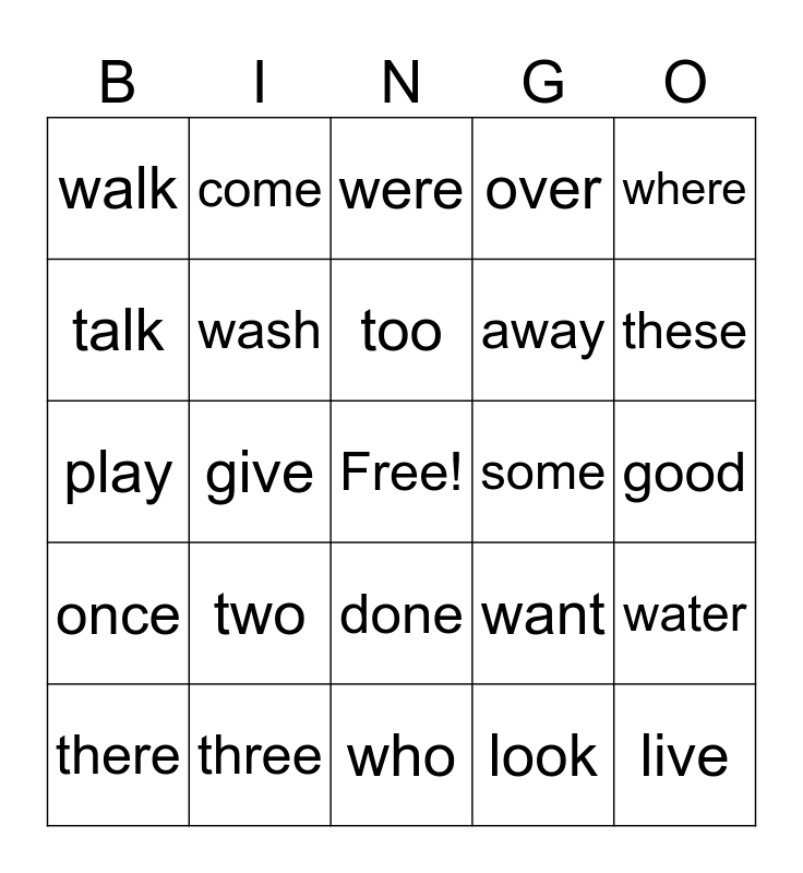 This bingo card has a free space and 24 words: two, three, too, there, where, walk, talk, come, some, done, away, play, want, water, wash, look, good, were, these, give, live, once, over and who.