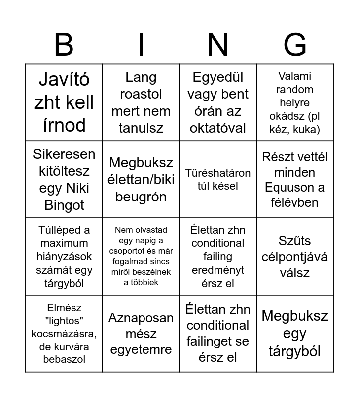 This bingo card has 16 words: Aznaposan mész egyetemre, Szűts célpontjává válsz, Egyedül vagy bent órán az oktatóval, Javító zht kell írnod, Túlléped a maximum hiányzások számát egy tárgyból, Lang roastol mert nem tanulsz, Élettan zhn conditional failing eredményt érsz el, Élettan zhn conditional failinget se érsz el, Sikeresen kitöltesz egy Niki Bingot, Megbuksz élettan/biki beugrón, Elmész "lightos" kocsmázásra, de kurvára bebaszol, Valami random helyre okádsz (pl kéz, kuka), Nem olvastad egy napig a csoportot és már fogalmad sincs miről beszélnek a többiek, Részt vettél minden Equuson a félévben, Tűréshatáron túl késel and Megbuksz egy tárgyból.