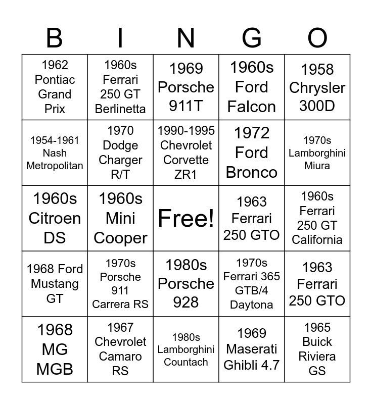 This bingo card has a free space and 62 words: 1957 Chevrolet Bel Air, 1967 Chevrolet Camaro RS, 1967 Pontiac GTO, 1968 Ford Mustang GT, 1969 Ford Mustang Mach 1, 1969 Chevrolet Camaro, 1970 Dodge Charger R/T, 1971 Plymouth Superbird, 1972 Ford Bronco, 1957 Ford Thunderbird, 1960s Ford Falcon, 1954 Chevrolet Bel Air Sport Coupe, 1954-1961 Nash Metropolitan, 1957 Chrysler 300C, 1961 Pontiac Ventura Hardtop, 1962 Pontiac Grand Prix, 1965 Buick Riviera GS, 1958 Chrysler 300D, 1967 Chevrolet Corvette Stingray, 1990-1995 Chevrolet Corvette ZR1, 1963 Ferrari 250 GTO, 1969 Porsche 911T, 1968 MG MGB, 1969 Maserati Ghibli 4.7, 1966 Shelby 427 Cobra, 1981 DeLorean DMC 12, 1981 Lotus Esprit Turbo, 1960s Jaguar E-Type, 1963 Ferrari 250 GTO, 1969 Porsche 911T, 1968 MG MGB, 1950s Mercedes-Benz 300 SL Gullwing, 1960s Aston Martin DB4, 1960s Aston Martin DB5, 1960s Ferrari 250 GT California, 1960s Ferrari 250 GT Berlinetta, 1960s Alfa Romeo Giulia Sprint GT, 1960s Triumph TR4, 1960s Mini Cooper, 1960s Volkswagen Beetle, 1960s Citroen DS, 1970s BMW 3.0 CSL, 1970s Porsche 911 Carrera RS, 1970s Lotus Esprit, 1970s Lamborghini Miura, 1970s Ferrari 365 GTB/4 Daytona, 1970s Ferrari 365 GTS/4 Daytona, 1970s Maserati Biturbo, 1970s Volvo 1800ES, 1980s Ferrari 328 GTB, 1980s Porsche 928, 1980s Lamborghini Countach, 1980s Mercedes-Benz 500 SEC, 1980s BMW M3, 1980s Audi Quattro, 1980s Lancia Beta Montecarlo, 1980s Ferrari Testarossa, 1990s Ferrari F40, 1990s McLaren F1, 1990s Porsche 911 (964), 1990s BMW Z1 and 1990s Bugatti EB110.