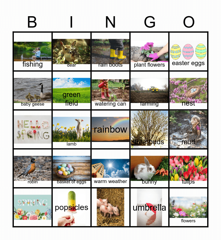 This bingo card has 33 images and 31 words: flowers, tulips, lamb, chick, robin, green field, easter eggs, dear, garden soil, watering can, rain boots, rainbow, rain, tree buds, nest, popsicles, basket of eggs, bunny, warm weather, humming bird, fishing, mud, piglets, rainbow, plant flowers, farming, baby geese, tulips, gardening, umbrella and baseball.