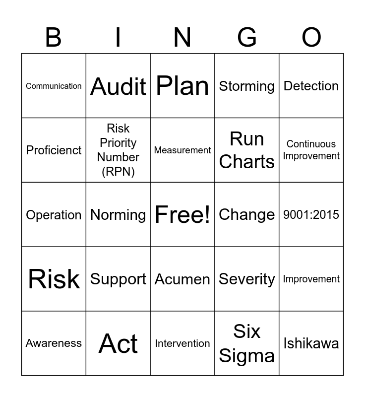 This bingo card has a free space and 31 words: Intervention, QMS, Norming, People, Communication, Plan, Risk Priority Number (RPN), Severity, Change, Six Sigma, 9001:2015, Ishikawa, Qualitative, Root Cause, Continuous Improvement, Symptom, Improvement, Support, Risk, Acumen, Detection, Resistance, Awareness, Audit, Run Charts, Proficienct, Storming, Operation, Act, Measurement and Competencies.