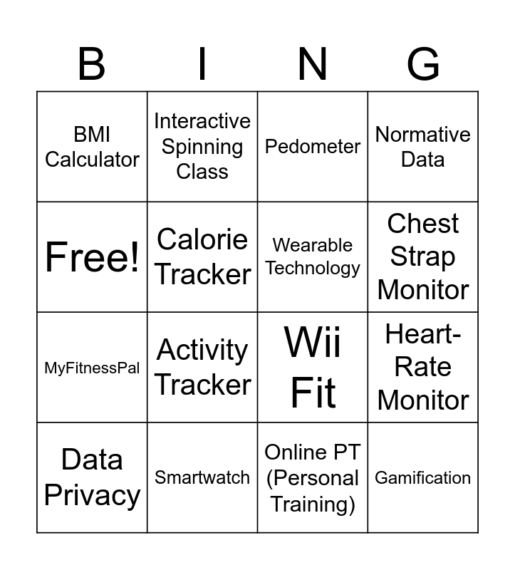 This bingo card has 16 words: Smartwatch, Heart-Rate Monitor, Pedometer, BMI Calculator, MyFitnessPal, Interactive Spinning Class, Wii Fit, Online PT (Personal Training), Free!, Calorie Tracker, Data Privacy, Normative Data, Activity Tracker, Chest Strap Monitor, Wearable Technology and Gamification.