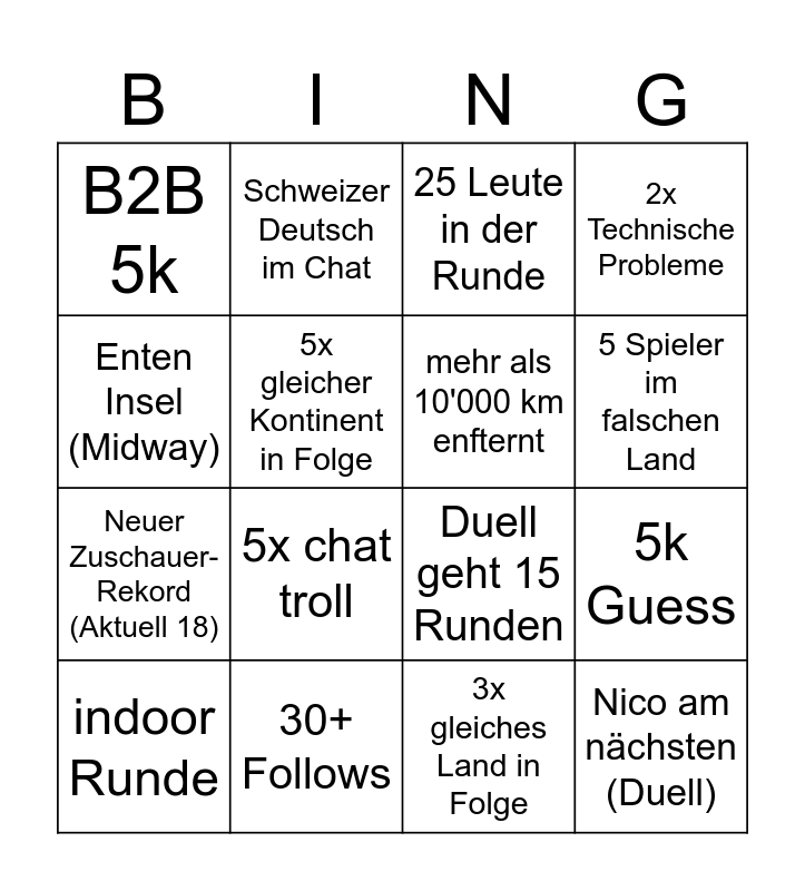 This bingo card has 16 words: 30+ Follows, 5k Guess, 25 Leute in der Runde, B2B 5k, Neuer Zuschauer-Rekord (Aktuell 18), Schweizer Deutsch im Chat, Duell geht 15 Runden, 3x gleiches Land in Folge, Enten Insel (Midway), 5x gleicher Kontinent in Folge, indoor Runde, 2x Technische Probleme, 5x chat troll, 5 Spieler im falschen Land, mehr als 10'000 km enfternt and Nico am nächsten (Duell).