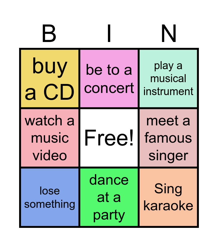 This bingo card has a free space and 8 words: meet a famous singer, play a musical instrument, be to a concert, lose something, buy a CD, Sing karaoke, watch a music video and dance at a party.