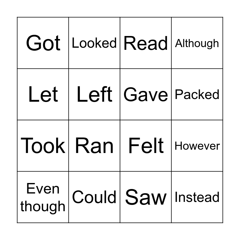 This bingo card has 24 words: Was/Were, Found, Packed, Told, Let, Got, Left, Looked, Could, Started, Took, Felt, Fell, Kept, Gave, Went, Saw, Read, Ran, However, Even though, Instead, Although and But.