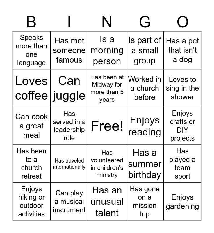 This bingo card has a free space and 24 words: Has traveled internationally, Can play a musical instrument, Has been at Midway for more than 5 years, Enjoys hiking or outdoor activities, Has a pet that isn't a dog, Speaks more than one language, Loves coffee, Has met someone famous, Enjoys reading, Has volunteered in children's ministry, Worked in a church before, Can cook a great meal, Has a summer birthday, Has played a team sport, Can juggle, Has gone on a mission trip, Enjoys crafts or DIY projects, Is a morning person, Loves to sing in the shower, Has served in a leadership role, Enjoys gardening, Has been to a church retreat, Is part of a small group and Has an unusual talent.