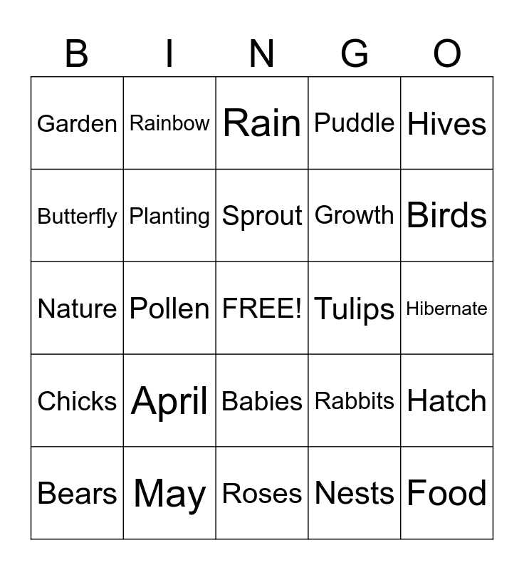 This bingo card has a free space and 29 words: Bears, Bees, Pollen, Flowers, Garden, Rain, Planting, April, Tulips, May, Hibernate, Food, Roses, Nests, Birds, Eggs, Babies, Chicks, Hives, Nature, Rabbits, Grass, Growth, Butterfly, Puddle, Rainbow, Hatch, Sprout and Ladybug.