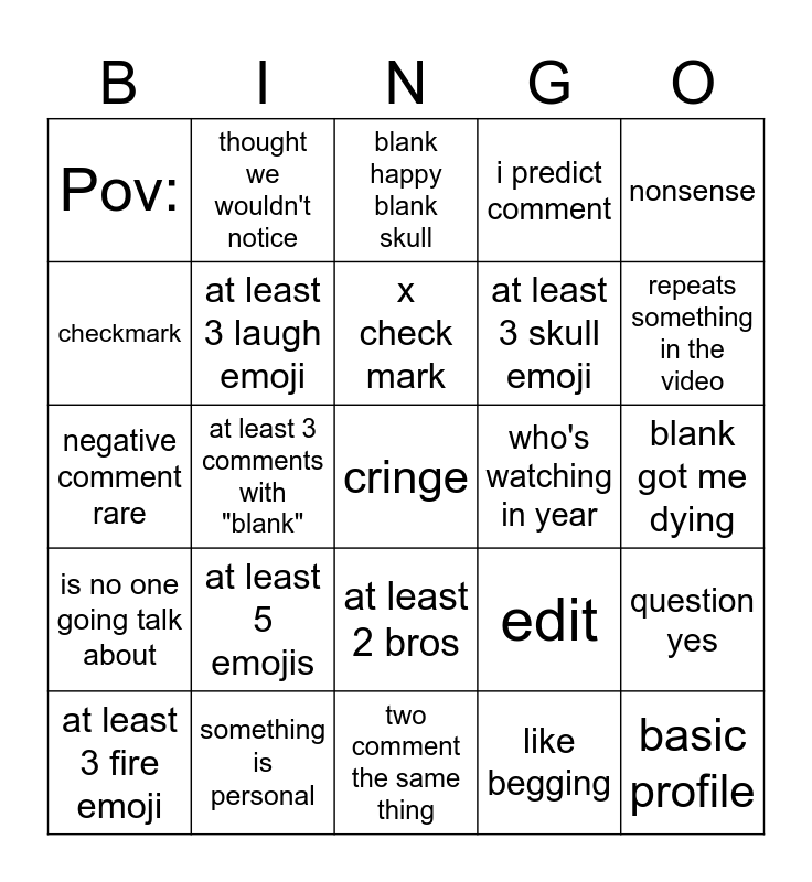 This bingo card has a free space and 24 words: at least 3 fire emoji, at least 5 emojis, x check mark, like begging, nonsense, Pov:, thought we wouldn't notice, blank happy blank skull, who's watching in year, blank got me dying, negative comment rare, at least 3 laugh emoji, edit, question yes, checkmark, something is personal, two comment the same thing, i predict comment, repeats something in the video, is no one going talk about, at least 3 comments with "blank", at least 2 bros, at least 3 skull emoji and basic profile.
