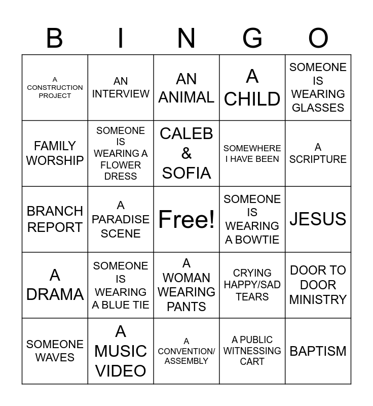This bingo card has a free space and 24 words: SOMEONE WAVES, SOMEONE IS WEARING A BLUE TIE, CALEB & SOFIA, A PUBLIC WITNESSING CART, SOMEONE IS WEARING GLASSES, A CONSTRUCTION PROJECT, AN INTERVIEW, AN ANIMAL, SOMEONE IS WEARING A BOWTIE, JESUS, BRANCH REPORT, SOMEONE IS WEARING A FLOWER DRESS, CRYING HAPPY/SAD TEARS, DOOR TO DOOR MINISTRY, FAMILY WORSHIP, A MUSIC VIDEO, A CONVENTION/ ASSEMBLY, A CHILD, A SCRIPTURE, A DRAMA, A PARADISE SCENE, A WOMAN WEARING PANTS, SOMEWHERE I HAVE BEEN and BAPTISM.
