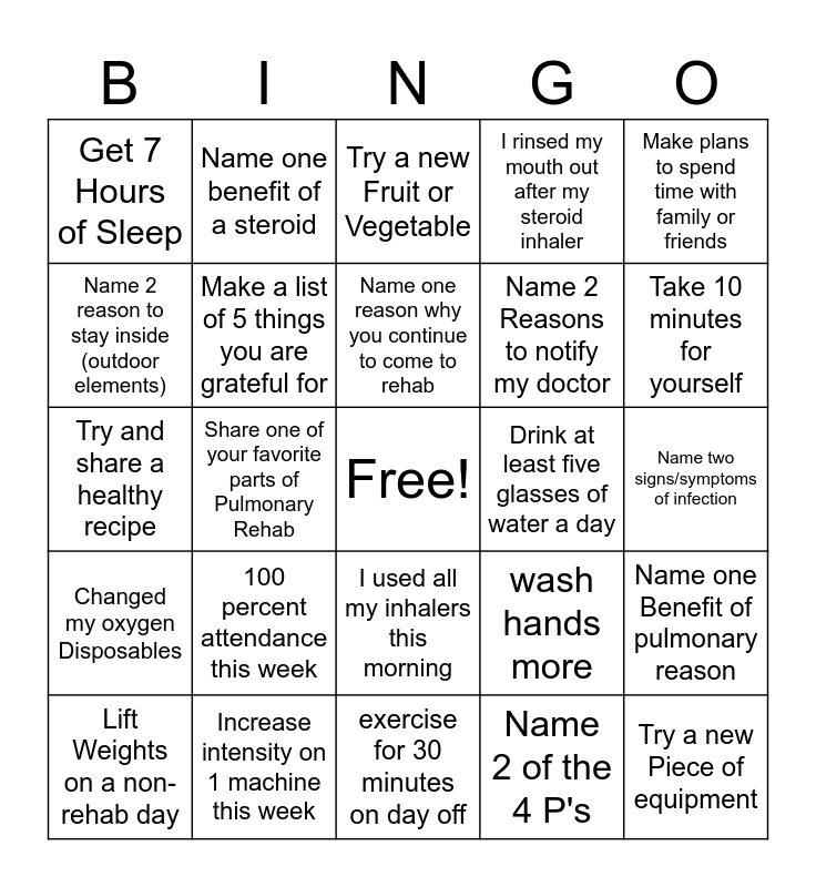 This bingo card has a free space and 29 words: Lift Weights on a non-rehab day, Do one stress relieving activity, Share one of your favorite parts of Pulmonary Rehab, Practice one minute of Purse lip breathing, Get 7 Hours of Sleep, Try a new Fruit or Vegetable, Make a list of 5 things you are grateful for, 100 percent attendance this week, Drink at least five glasses of water a day, Increase intensity on 1 machine this week, Name two signs/symptoms of infection, Try a new Piece of equipment, exercise for 30 minutes on day off, Name 2 of the 4 P's, Take 10 minutes for yourself, What is your rescue inhaler ??, I used all my inhalers this morning, Changed my oxygen Disposables, Make plans to spend time with family or friends, Try and share a healthy recipe, wash hands more, Use pursed lip breathing while using stairs, Name 2 Reasons to notify my doctor, Name 2 reason to stay inside (outdoor elements), I rinsed my mouth out after my steroid inhaler, Name one benefit of a steroid, Name one Benefit of pulmonary reason, Name one reason why you continue to come to rehab and Name your lung disease.