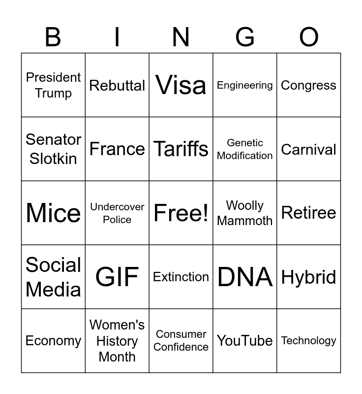 This bingo card has a free space and 24 words: GIF, Women's History Month, Tariffs, Economy, Congress, President Trump, Senator Slotkin, Rebuttal, Woolly Mammoth, Extinction, Genetic Modification, Mice, DNA, Hybrid, France, YouTube, Retiree, Visa, Carnival, Undercover Police, Technology, Social Media, Engineering and Consumer Confidence.
