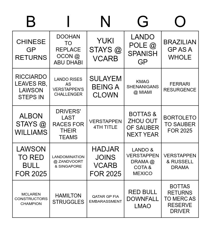 This bingo card has 25 words: LANDOMINATION @ ZANDVOORT & SINGAPORE, QATAR GP FIA EMBARASSMENT, SULAYEM BEING A CLOWN, MCLAREN CONSTRUCTORS CHAMPION, BRAZILIAN GP AS A WHOLE, CHINESE GP RETURNS, RICCIARDO LEAVES RB, LAWSON STEPS IN, DOOHAN TO REPLACE OCON @ ABU DHABI, BOTTAS & ZHOU OUT OF SAUBER NEXT YEAR, HADJAR JOINS VCARB FOR 2025, KMAG SHENANIGANS @ MIAMI, ALBON STAYS @ WILLIAMS, LANDO & VERSTAPPEN DRAMA @ COTA & MEXICO, VERSTAPPEN & RUSSELL DRAMA, LANDO RISES AS VERSTAPPEN'S CHALLENGER, BOTTAS RETURNS TO MERC AS RESERVE DRIVER, BORTOLETO TO SAUBER FOR 2025, YUKI STAYS @ VCARB, FERRARI RESURGENCE, DRIVERS' LAST RACES FOR THEIR TEAMS, VERSTAPPEN 4TH TITLE, HAMILTON STRUGGLES, LAWSON TO RED BULL FOR 2025, LANDO POLE @ SPANISH GP and RED BULL DOWNFALL LMAO.