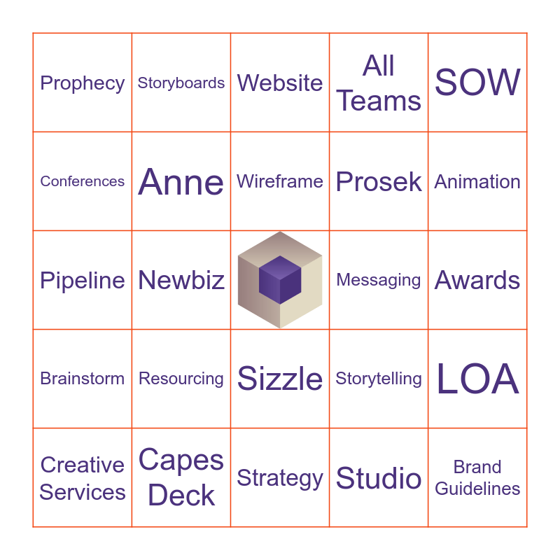 This bingo card has a free space and 56 words: ZD, Creative Services, Design, Prophecy, Strategy, Neil, Anne, Jen, Prosek, Happy Hour, All Teams, Tune Up, Figma, Workshop, Copy, Content, SOW, Newbiz, Pitch, Brand Guidelines, Messaging, Templates, Storytelling, Website, Narrative, Wireframe, Iconography, Marketing, Animation, Synergy, AI, Thought Leadership, Scalability, Campaign, Awards, Conferences, Pipeline, RFP, Brainstorm, Storyboards, Sizzle, Kick-Off, Account, Brand Film, Pantone, Resourcing, Capes Deck, Huddle, Viz ID, RFP, Studio, Sitemap, Photoshop, Showcase, LOA and Slack.