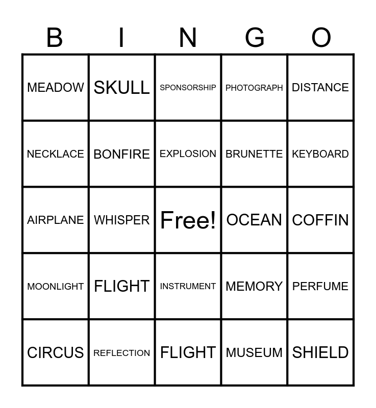 This bingo card has a free space and 24 words: FLIGHT, REFLECTION, EXPLOSION, CIRCUS, DISTANCE, MEADOW, NECKLACE, SKULL, OCEAN, INSTRUMENT, BRUNETTE, AIRPLANE, MEMORY, PERFUME, BONFIRE, MUSEUM, COFFIN, SPONSORSHIP, KEYBOARD, WHISPER, SHIELD, MOONLIGHT, PHOTOGRAPH and FLIGHT.