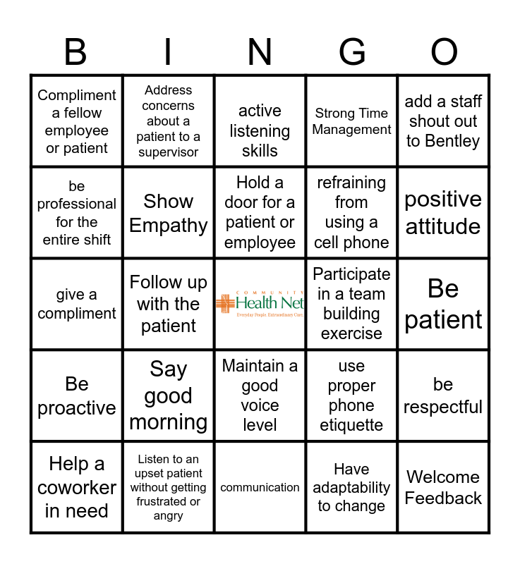 This bingo card has a free space and 24 words: Say good morning, Listen to an upset patient without getting frustrated or angry, Hold a door for a patient or employee, Help a coworker in need, add a staff shout out to Bentley, Compliment a fellow employee or patient, be professional for the entire shift, Address concerns about a patient to a supervisor, Participate in a team building exercise, Maintain a good voice level, refraining from using a cell phone, give a compliment, use proper phone etiquette, be respectful, Show Empathy, Have adaptability to change, Be patient, active listening skills, positive attitude, Follow up with the patient, Welcome Feedback, Be proactive, Strong Time Management and communication.
