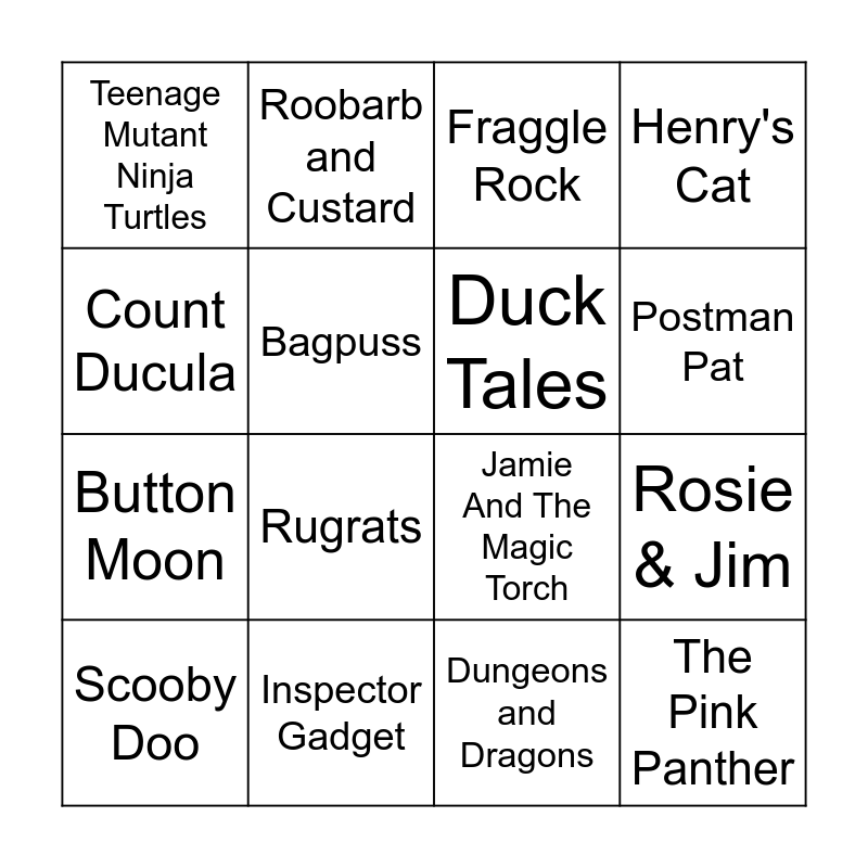 This bingo card has 30 words: Raggy Dolls, Clangers, Rosie & Jim, Jimbo And The Jetset, Teenage Mutant Ninja Turtles, Fraggle Rock, Duck Tales, Thundercats, Inspector Gadget, Hong Kong Phooey, Dungeons and Dragons, Scooby Doo, Catch The Pigeon, The Flintstones, Rugrats, The Racoons, Pinky and The Brain, The Pink Panther, Trap Door, Count Ducula, Jamie And The Magic Torch, Poddington Peas, Roobarb and Custard, Button Moon, Bagpuss, Henry's Cat, Fireman Sam, Rainbow, Postman Pat and Puff The Magic Dragon.