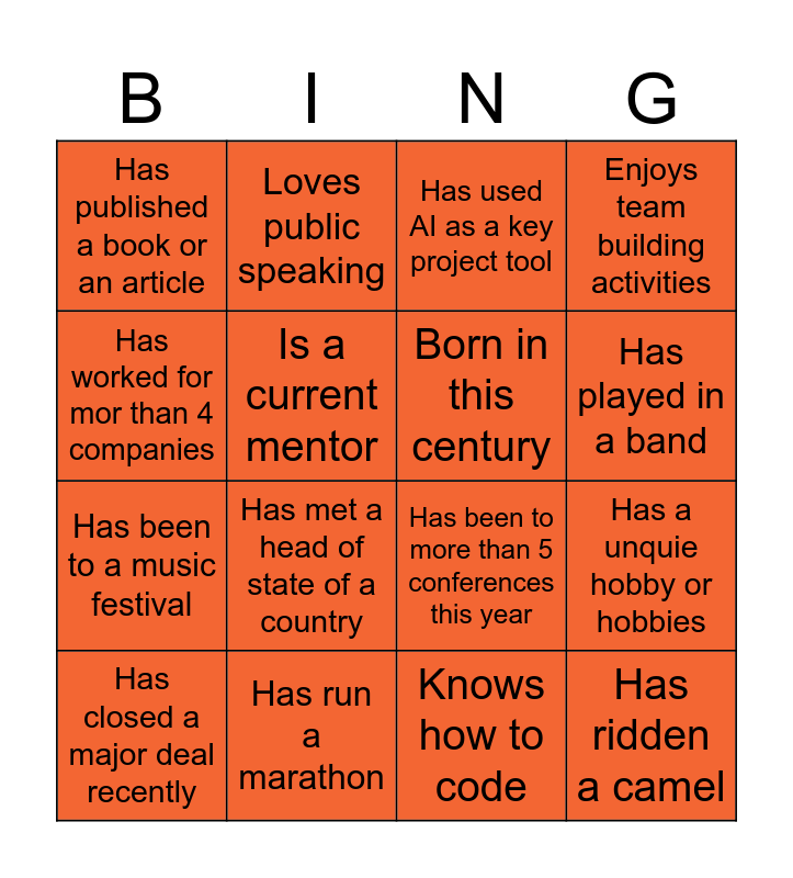 This bingo card has 16 words: Has run a marathon, Has a unquie hobby or hobbies, Has used AI as a key project tool, Has published a book or an article, Has been to a music festival, Loves public speaking, Has been to more than 5 conferences this year, Knows how to code, Has worked for mor than 4 companies, Is a current mentor, Has closed a major deal recently, Enjoys team building activities, Has met a head of state of a country, Has played in a band, Born in this century and Has ridden a camel.
