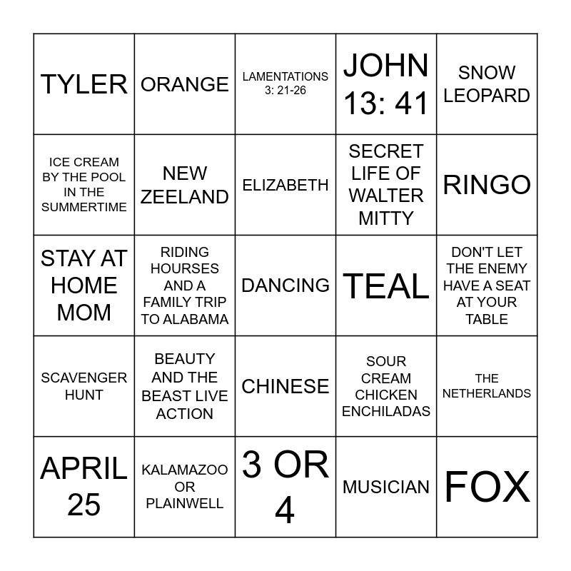 This bingo card has a free space and 24 words: BEAUTY AND THE BEAST LIVE ACTION, KALAMAZOO OR PLAINWELL, ELIZABETH, APRIL 25, SNOW LEOPARD, TYLER, ICE CREAM BY THE POOL IN THE SUMMERTIME, ORANGE, TEAL, CHINESE, SECRET LIFE OF WALTER MITTY, STAY AT HOME MOM, SOUR CREAM CHICKEN ENCHILADAS, THE NETHERLANDS, NEW ZEELAND, MUSICIAN, DON'T LET THE ENEMY HAVE A SEAT AT YOUR TABLE, LAMENTATIONS 3: 21-26, RINGO, RIDING HOURSES AND A FAMILY TRIP TO ALABAMA, FOX, SCAVENGER HUNT, JOHN 13: 41 and 3 OR 4.