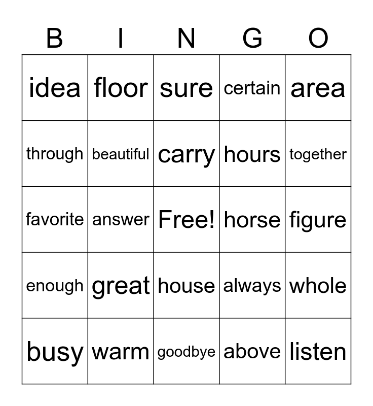 This bingo card has a free space and 24 words: great, warm, carry, busy, area, idea, through, floor, horse, house, hours, favorite, always, whole, beautiful, above, figure, sure, together, answer, listen, enough, certain and goodbye.