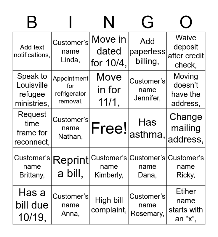 This bingo card has a free space and 78 words: Set daily ip,, Move out dated for 10/6,, Move in dated for 10/4,, Reconnect same day,, Change name due to marriage,, Add spouse,, Put in ZLIR,, transfer call to BSC,, Conference w/Spanish,, Bill deposit,, Enter zf25,, Enter zf30,, Add paperless billing,, Add text notifications,, Give current bill balance,, Speak to Louisville refugee ministries,, Update phone #,, Reprint a bill,, Fax a verification of service,, Change mailing address,, Remove a bp from an account,, Waive deposit after credit check,, Request time frame for reconnect,, Move in for 11/1,, Appointment for refrigerator removal,, Employed with USPS,, Employed at Amazon,, Recently had a baby,, Recently purchased first home,, Dropped call,, Moving doesn’t have the address,, Call in for office hours,, High bill complaint,, Final pay date 10/21,, Has a bill due 10/19,, Has asthma,, On Social Security,, Just got out of the hospital,, First name longer than 10 letters,, Etiher name starts with an “x”,, Either name starts with a “y”,, Either name starts with an “x”,, Customer’s name John,, Customer’s name Robert,, Customer’s name Sarah,, Customer’s name Linda,, Customer’s name Barbara,, Customer’s name Martha,, Customer’s name Glen,, Customer’s name Roy,, Customer’s name Ricky,, Customer’s name Nathan,, Customer’s name Dana,, Customer’s name Mary,, Customer’s name William,, Customer’s name Andrew,, Customer’s name David,, Customer’s name Pam,, Customer’s name Benny,, Customer’s name Kimberly,, Customer’s name Jennifer,, Customer’s name Brian,, Customer’s name Thomas,, Customer’s name Michael,, Customer’s name Rachel,, Customer’s name Lauren,, Customer’s name Sam,, Customer’s name Christopher,, Customer’s name Brittany,, Customer’s name Anna,, Customer’s name Lisa,, Customer’s name Billy,, Customer’s name Frank,, Customer’s name Theodore,, Customer’s name Rosemary,, Customer’s name Rebecca,, Customer’s name Liam, and Customer’s name Phillip.