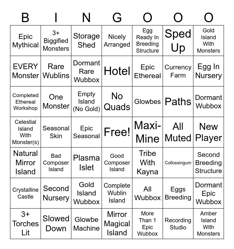 This bingo card has a free space and 48 words: All Wubbox, Currency Farm, Mirror Magical Island, Seasonal Skin, Empty Island (No Gold), New Player, 3+ Biggified Monsters, Slowed Down, Sped Up, Good Composer Island, Gold Island With Monsters, Nicely Arranged, Paths, Glowbes, Crystalline Castle, All Muted, EVERY Monster, Egg In Nursery, Eggs Breeding, Egg Ready In Breeding Structure, Epic Ethereal, Epic Seasonal, Epic Mythical, Rare Wublins, Dormant Epic Wubbox, Dormant Rare Wubbox, Dormant Wubbox, 3+ Torches Lit, No Quads, One Monster, Recording Studio, Maxi-Mine, Second Breeding Structure, Second Nursery, Celestial Island With Monster(s), Tribe With Kayna, Collossingum, Completed Ethereal Workshop, Plasma Islet, Gold Island Wubbox, Natural Mirror Island, Amber Island With Monsters, Storage Shed, Glowbe Machine, Hotel, Complete Wublin Island, Bad Composer Island and More Than 1 Epic Wubbox.