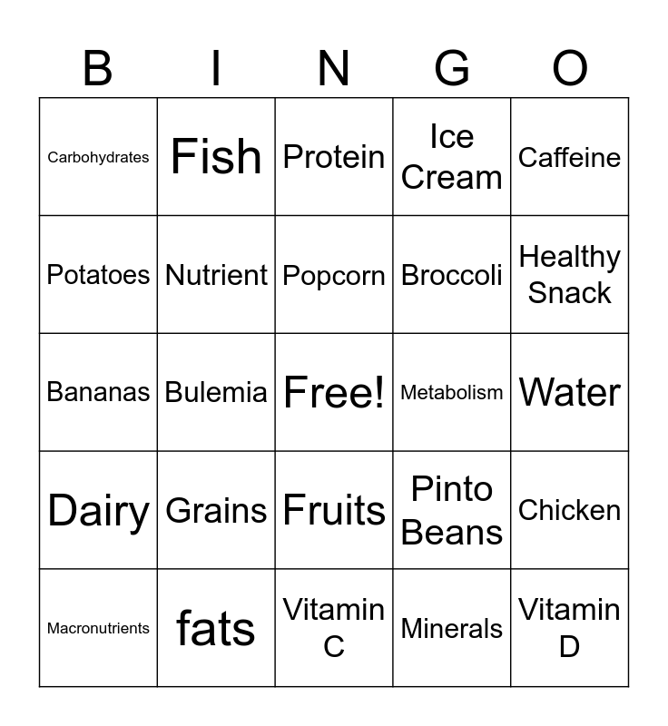 This bingo card has a free space and 29 words: Macronutrients, Micronutrients, Bulemia, Anorexia, Carbohydrates, Protein, Nutrient, Grains, Metabolism, fats, Water, Vitamin D, Vitamin C, Minerals, Healthy Snack, Vegetables, Fruits, Dairy, Caffeine, Bananas, Pinto Beans, Carrots, Broccoli, Potatoes, Ice Cream, Fish, Chicken, Popcorn and Orange Juice.