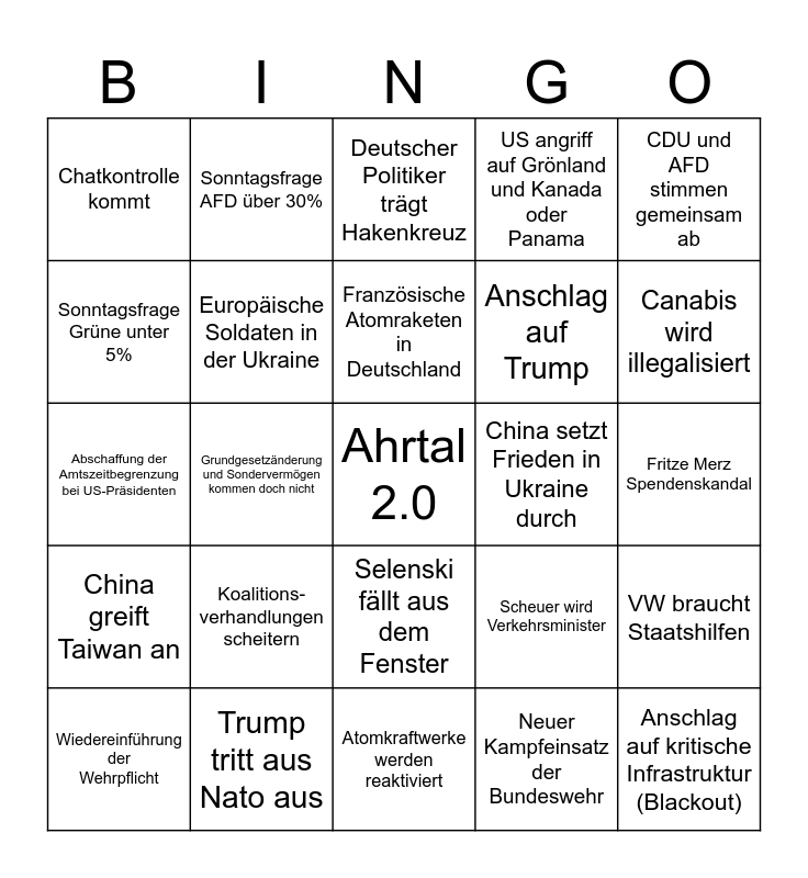 This bingo card has a free space and 24 words: Koalitions- verhandlungen scheitern, Trump tritt aus Nato aus, Französische Atomraketen in Deutschland, Wiedereinführung der Wehrpflicht, CDU und AFD stimmen gemeinsam ab, Chatkontrolle kommt, Sonntagsfrage Grüne unter 5%, Sonntagsfrage AFD über 30%, China setzt Frieden in Ukraine durch, Selenski fällt aus dem Fenster, Anschlag auf Trump, Abschaffung der Amtszeitbegrenzung bei US-Präsidenten, Scheuer wird Verkehrsminister, VW braucht Staatshilfen, Europäische Soldaten in der Ukraine, Neuer Kampfeinsatz der Bundeswehr, Fritze Merz Spendenskandal, Deutscher Politiker trägt Hakenkreuz, Canabis wird illegalisiert, Grundgesetzänderung und Sondervermögen kommen doch nicht, Anschlag auf kritische Infrastruktur (Blackout), China greift Taiwan an, US angriff auf Grönland und Kanada oder Panama and Atomkraftwerke werden reaktiviert.