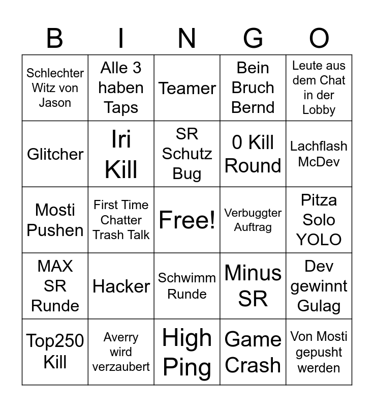 This bingo card has a free space and 24 words: Hacker, Averry wird verzaubert, SR Schutz Bug, Top250 Kill, Leute aus dem Chat in der Lobby, Schlechter Witz von Jason, Glitcher, Alle 3 haben Taps, Verbuggter Auftrag, Schwimm Runde, 0 Kill Round, Mosti Pushen, Minus SR, Dev gewinnt Gulag, Iri Kill, Game Crash, Pitza Solo YOLO, Teamer, Lachflash McDev, First Time Chatter Trash Talk, Von Mosti gepusht werden, MAX SR Runde, Bein Bruch Bernd and High Ping.