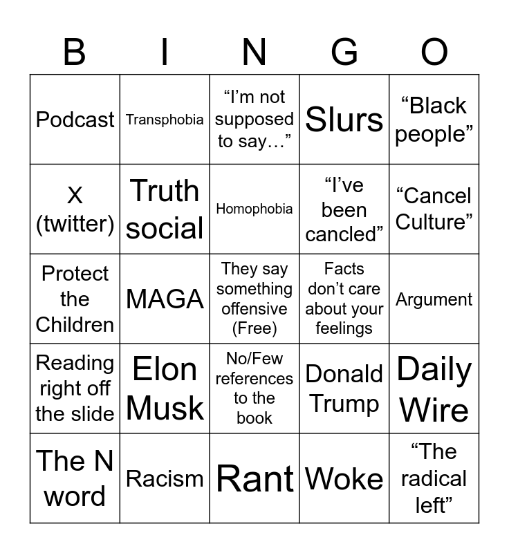 This bingo card has a free space and 24 words: Elon Musk, Racism, Homophobia, The N word, “Black people”, Podcast, X (twitter), Transphobia, Facts don’t care about your feelings, No/Few references to the book, “I’ve been cancled”, Protect the Children, Donald Trump, Daily Wire, Truth social, Woke, Argument, “I’m not supposed to say…”, “Cancel Culture”, MAGA, “The radical left”, Reading right off the slide, Slurs and Rant.