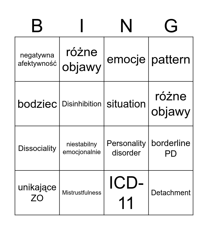 This bingo card has 16 words: Mistrustfulness, borderline PD, emocje, negatywna afektywność, Dissociality, różne objawy, Personality disorder, ICD-11, bodziec, Disinhibition, unikające ZO, pattern, niestabilny emocjonalnie, różne objawy, situation and Detachment.
