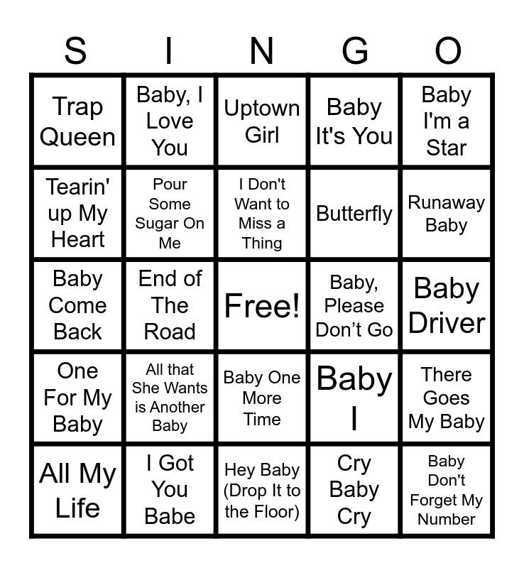 This bingo card has a free space and 77 words: Sugar Sugar, Let's Get it On, Uptown Girl, Signed, Sealed, Delivered, Build Me Up Buttercup, Hold On, Let's Hear it for the Boy, Don't Go Breaking My Heart, You Sexy Thing, My Girl, Baby Boy, Babyfather, I Don't Want to Miss a Thing, Tearin' up My Heart, I Want It That Way, End of The Road, Because You Loved Me, Baby Don't Forget My Number, Baby Makes Her Blue Jeans Talk, Baby I'm a Star, Baby, Come to Me, Baby Come Back, Pour Some Sugar On Me, Baby, I Love You, Baby It's You, Baby's In Black, Baby Blue, Baby I'm Yours, Baby Don't Get Hooked On Me, Baby's Got her Blue Jeans On, Baby Girl, Where Did My Baby Go, Baby Be Mine, Baby I, Runaway Baby, Butterfly, Bossa Nova Baby, Hey! Baby, Baby Driver, Cry Baby Cry, Baby Hold On, Baby, I Love Your Way, Baby Love, Always Be My Baby, Be My Baby, Hey Baby, All My Life, Trap Queen, Come Baby Come, Be My Baby Tonight, Ice Ice Baby, Baby One More Time, Baby, Santa Baby, Baby Shark, Baby Got Back, Baby Baby, Baby I Need Your Loving, Can't Get Enough Of You Baby, Baby Come Back, All that She Wants is Another Baby, Come On Over Baby, Baby You Can Drive My Car, Baby Can I Hold You, I'm Your Baby Tonight, Somebody's Baby, Born To Be My Baby, Baby, Please Don’t Go, Nobody Puts Baby In The Corner, Sweet Baby James, American Baby, There Goes My Baby, One For My Baby, I Got You Babe, Baby It’s Cold Outside, Hey Baby (Drop It to the Floor) and Give It To Me Baby.