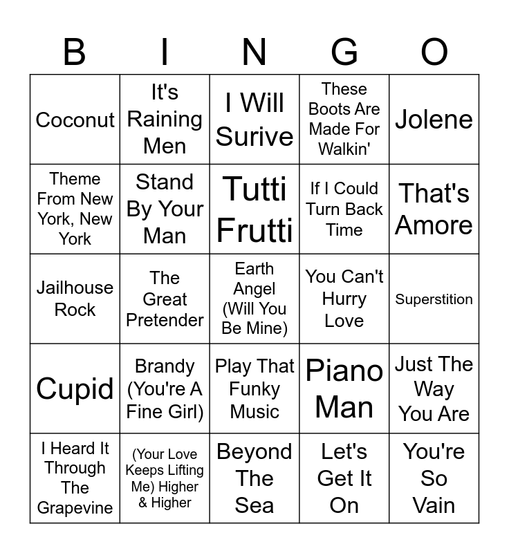 This bingo card has 90 words: (We're Gonna) Rock Around The Clock, At The Hop, Play That Funky Music, Lady Marmalade, Wake Me Up Before You Go-Go, Joy To The World, Don't Stop Believin', Mrs. Robinson, Tiny Dancer, Dancing Queen, Leader Of The Pack, Johnny B. Goode, You Make My Dreams (Come True), Superstition, Whole Lotta Shakin' Going On, Tutti Frutti, The Tracks Of My Tears, You're The First, The Last, My Everything, Don't Be Cruel, Sweet Caroline, It's The Same Old Song, Fun, Fun, Fun, Beyond The Sea, If You Could Read My Mind, Jailhouse Rock, (Your Love Keeps Lifting Me) Higher & Higher, Brown Sugar, Uptight (Everything's Alright), Rhinestone Cowboy, Bad Moon Rising, War, Just The Way You Are, Daydream Believer, Cupid, Coconut, These Boots Are Made For Walkin', I Will Surive, Your Song, The Great Pretender, That's Amore, I Heard It Through The Grapevine, Theme From New York, New York, Take Me Home, Country Roads, You Make Me Feel So Young, I'm A Believer, Piano Man, I Wanna Dance With Somebody (Who Loves Me), Tequila, Stayin' Alive, September (Do You Remember), Billie Jean, If I Could Turn Back Time, Lean On Me, Mack The Knife, What A Wonderful World, Blueberry Hill, You Can't Hurry Love, I Want To Hold Your Hand, Rocket Man, Different Drum, Bus Stop, Livin' On A Prayer, (Sittin' On) The Dock Of The Bay, Baby Love, Son Of A Preacher Man, Uptown Girl, Why Do Fools Fall In Love, Let's Get It On, The Lady Is A Tramp, Build Me Up Buttercup, Brandy (You're A Fine Girl), Earth Angel (Will You Be Mine), Then He Kissed Me, We Will Rock You, It's Raining Men, Stand By Your Man, All I Have To Is Dream, All Night Long, Girls Just Want To Have Fun, All Shook Up, You're So Vain, Jolene, Killing Me Softly With His Song, Stand By Me, Hotel California, California Dreamin', Chantilly Lace, Yakety Yak, Y.M.C.A. and Suspicious Minds.