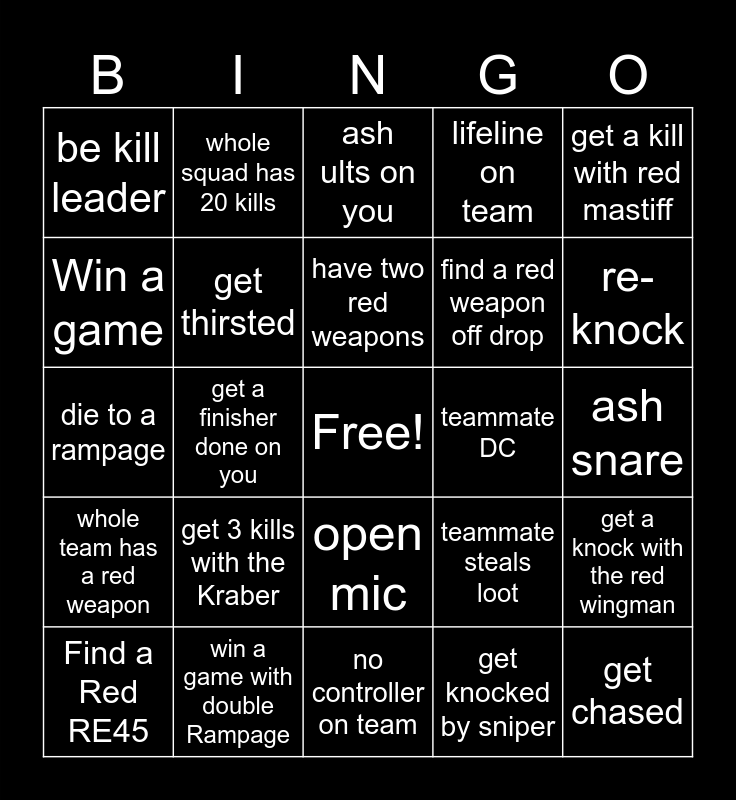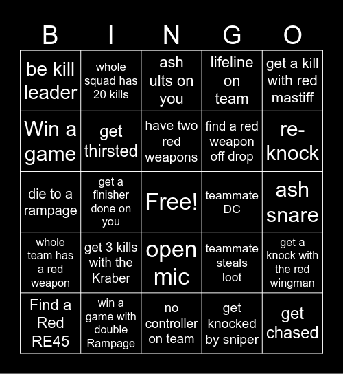 This bingo card has a free space and 24 words: get 3 kills with the Kraber, win a game with double Rampage, have two red weapons, Find a Red RE45, get a kill with red mastiff, be kill leader, Win a game, whole squad has 20 kills, teammate DC, open mic, find a red weapon off drop, die to a rampage, teammate steals loot, get a knock with the red wingman, get thirsted, get knocked by sniper, ash snare, ash ults on you, re-knock, get a finisher done on you, get chased, whole team has a red weapon, lifeline on team and no controller on team.