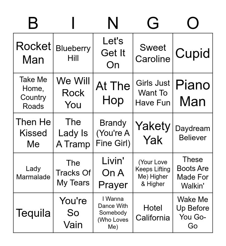 This bingo card has 90 words: I Heard It Through The Grapevine, The Great Pretender, Livin' On A Prayer, Theme From New York, New York, Mrs. Robinson, Different Drum, California Dreamin', Beyond The Sea, Brown Sugar, Billie Jean, You Make My Dreams (Come True), (We're Gonna) Rock Around The Clock, Tutti Frutti, Daydream Believer, Leader Of The Pack, At The Hop, You Make Me Feel So Young, Whole Lotta Shakin' Going On, Killing Me Softly With His Song, Uptown Girl, Lean On Me, I Will Surive, I Wanna Dance With Somebody (Who Loves Me), All Shook Up, Then He Kissed Me, You're So Vain, Dancing Queen, Don't Be Cruel, Superstition, Y.M.C.A., War, These Boots Are Made For Walkin', Coconut, Lady Marmalade, Rocket Man, Sweet Caroline, Let's Get It On, Uptight (Everything's Alright), The Lady Is A Tramp, Piano Man, Tequila, Take Me Home, Country Roads, Mack The Knife, Jolene, Just The Way You Are, (Your Love Keeps Lifting Me) Higher & Higher, Stand By Me, Suspicious Minds, September (Do You Remember), It's The Same Old Song, Stand By Your Man, Girls Just Want To Have Fun, Why Do Fools Fall In Love, Tiny Dancer, That's Amore, Bad Moon Rising, Yakety Yak, Bus Stop, If You Could Read My Mind, (Sittin' On) The Dock Of The Bay, Fun, Fun, Fun, Jailhouse Rock, You Can't Hurry Love, All Night Long, Earth Angel (Will You Be Mine), You're The First, The Last, My Everything, Build Me Up Buttercup, Hotel California, If I Could Turn Back Time, Baby Love, The Tracks Of My Tears, Brandy (You're A Fine Girl), Johnny B. Goode, Joy To The World, Blueberry Hill, We Will Rock You, Rhinestone Cowboy, Don't Stop Believin', I'm A Believer, I Want To Hold Your Hand, Wake Me Up Before You Go-Go, Cupid, It's Raining Men, Stayin' Alive, Chantilly Lace, All I Have To Is Dream, What A Wonderful World, Son Of A Preacher Man, Play That Funky Music and Your Song.