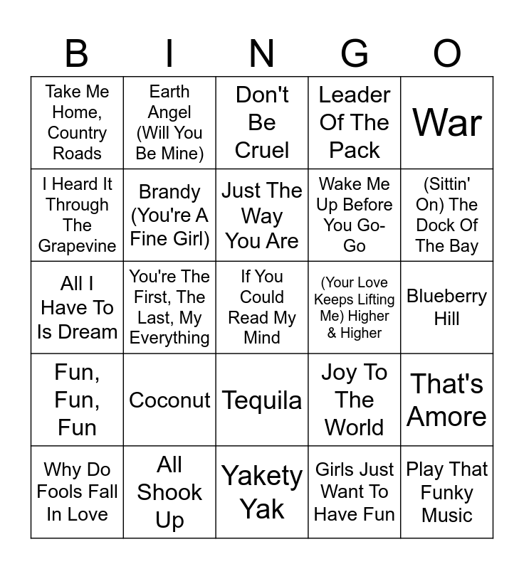This bingo card has 90 words: Hotel California, Bad Moon Rising, Tequila, Johnny B. Goode, Brown Sugar, Jolene, I Wanna Dance With Somebody (Who Loves Me), Theme From New York, New York, Bus Stop, Cupid, At The Hop, Whole Lotta Shakin' Going On, California Dreamin', Blueberry Hill, Lean On Me, Just The Way You Are, Build Me Up Buttercup, Uptown Girl, Livin' On A Prayer, What A Wonderful World, I'm A Believer, Don't Stop Believin', Yakety Yak, Rocket Man, All I Have To Is Dream, All Shook Up, If I Could Turn Back Time, Son Of A Preacher Man, Dancing Queen, Tiny Dancer, Rhinestone Cowboy, That's Amore, Stayin' Alive, Fun, Fun, Fun, Take Me Home, Country Roads, Leader Of The Pack, Don't Be Cruel, I Want To Hold Your Hand, You're The First, The Last, My Everything, (Sittin' On) The Dock Of The Bay, Why Do Fools Fall In Love, I Heard It Through The Grapevine, Chantilly Lace, You Can't Hurry Love, Jailhouse Rock, Joy To The World, Beyond The Sea, Stand By Your Man, September (Do You Remember), Piano Man, Superstition, Wake Me Up Before You Go-Go, Stand By Me, (We're Gonna) Rock Around The Clock, Mack The Knife, Y.M.C.A., (Your Love Keeps Lifting Me) Higher & Higher, Suspicious Minds, Mrs. Robinson, The Tracks Of My Tears, You Make Me Feel So Young, Your Song, Tutti Frutti, The Great Pretender, Lady Marmalade, Then He Kissed Me, Daydream Believer, Girls Just Want To Have Fun, These Boots Are Made For Walkin', Uptight (Everything's Alright), Coconut, If You Could Read My Mind, We Will Rock You, All Night Long, Earth Angel (Will You Be Mine), Brandy (You're A Fine Girl), Different Drum, Baby Love, You Make My Dreams (Come True), It's Raining Men, Play That Funky Music, War, Sweet Caroline, Killing Me Softly With His Song, Let's Get It On, Billie Jean, It's The Same Old Song, The Lady Is A Tramp, I Will Surive and You're So Vain.