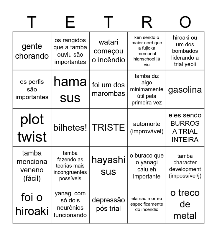 This bingo card has a free space and 24 words: tamba fazendo as teorias mais incongruentes possíveis, yanagi com só dois neurônios funcionando, foi um dos marombas, foi o hiroaki, hiroaki ou um dos bombados liderando a trial yepii, gente chorando, os perfis são importantes, os rangidos que a tamba ouviu são importantes, automorte (improvável), hayashi sus, tamba diz algo minimamente útil pela primeira vez, plot twist, o buraco que o yanagi caiu eh importante, tamba character development (impossível/j), hama sus, ela não morreu especificamente do incêndio, eles sendo BURROS A TRIAL INTEIRA, watari começou o incêndio, gasolina, bilhetes!, o treco de metal, tamba menciona veneno (fácil), ken sendo o maior nerd que a fujioka memorial highschool já viu and depressão pós trial.