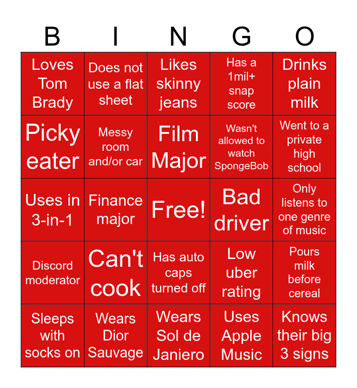 This bingo card has a free space and 24 words: Sleeps with socks on, Can't cook, Film Major, Uses Apple Music, Drinks plain milk, Loves Tom Brady, Does not use a flat sheet, Likes skinny jeans, Bad driver, Only listens to one genre of music, Uses in 3-in-1, Messy room and/or car, Low uber rating, Pours milk before cereal, Picky eater, Wears Dior Sauvage, Wears Sol de Janiero, Has a 1mil+ snap score, Went to a private high school, Discord moderator, Finance major, Has auto caps turned off, Wasn't allowed to watch SpongeBob and Knows their big 3 signs.